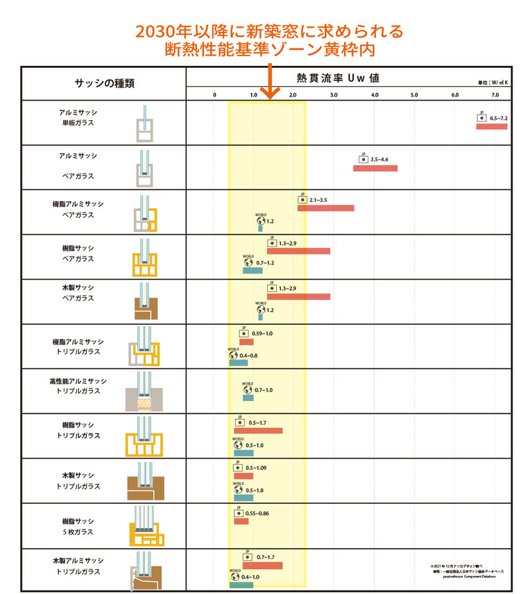 (注4)サッシ及び複層ガラスの次期目標基準値は、2030年に窓に求められる断熱性能をベースに算出。