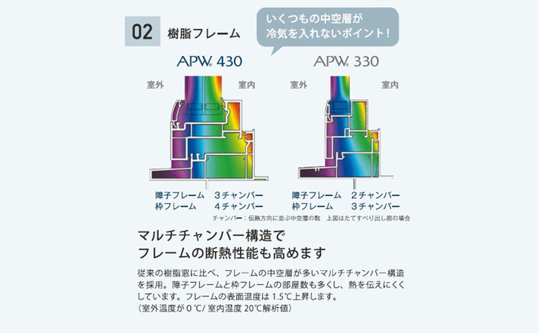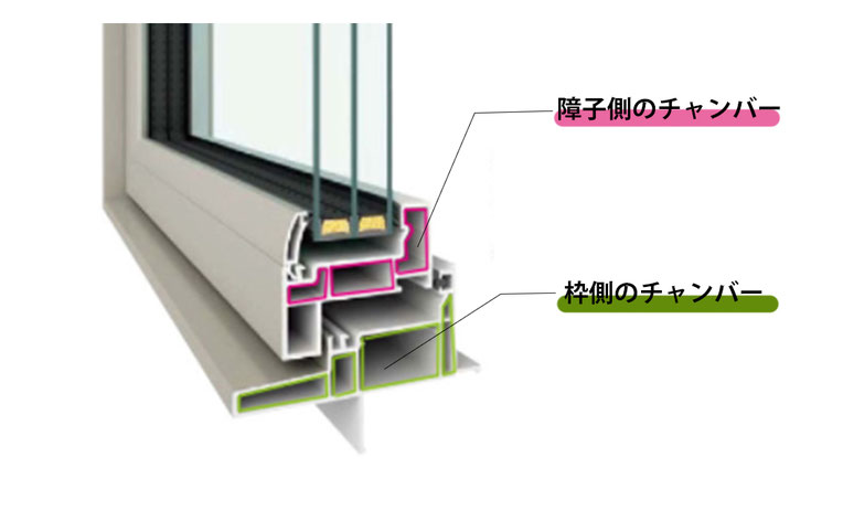 チャンバーは、いくつもの中空層があることで枠の断熱性能を高めることが出来ます。