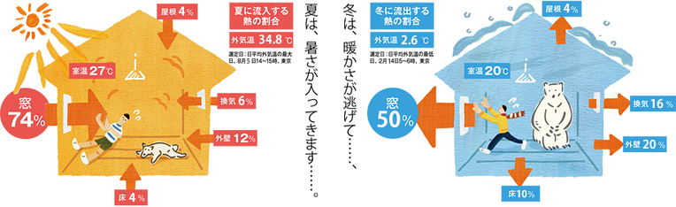 夏は窓から74%の暑い熱が室内に侵入し、冬は窓から50%の暖めた熱が屋外へ逃げていき、窓などの開口部から一年を通して多くのエネルギーをロスしていることがわかっています。