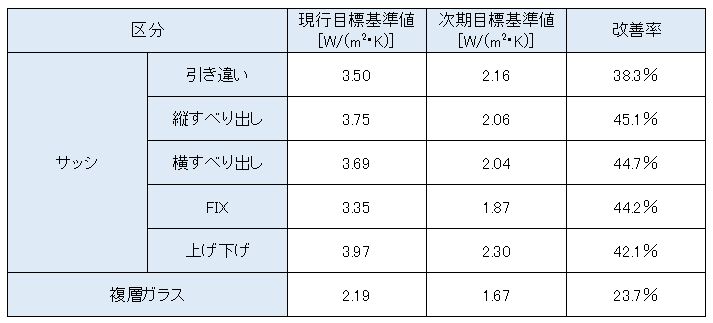 (注3)サッシの現行目標基準値と次期目標基準値は、想定している標準ガラスの性能値が異なるため、性能改善率はサッシのみによるものではない。また、新制度では代表サイズでの計算となっている。